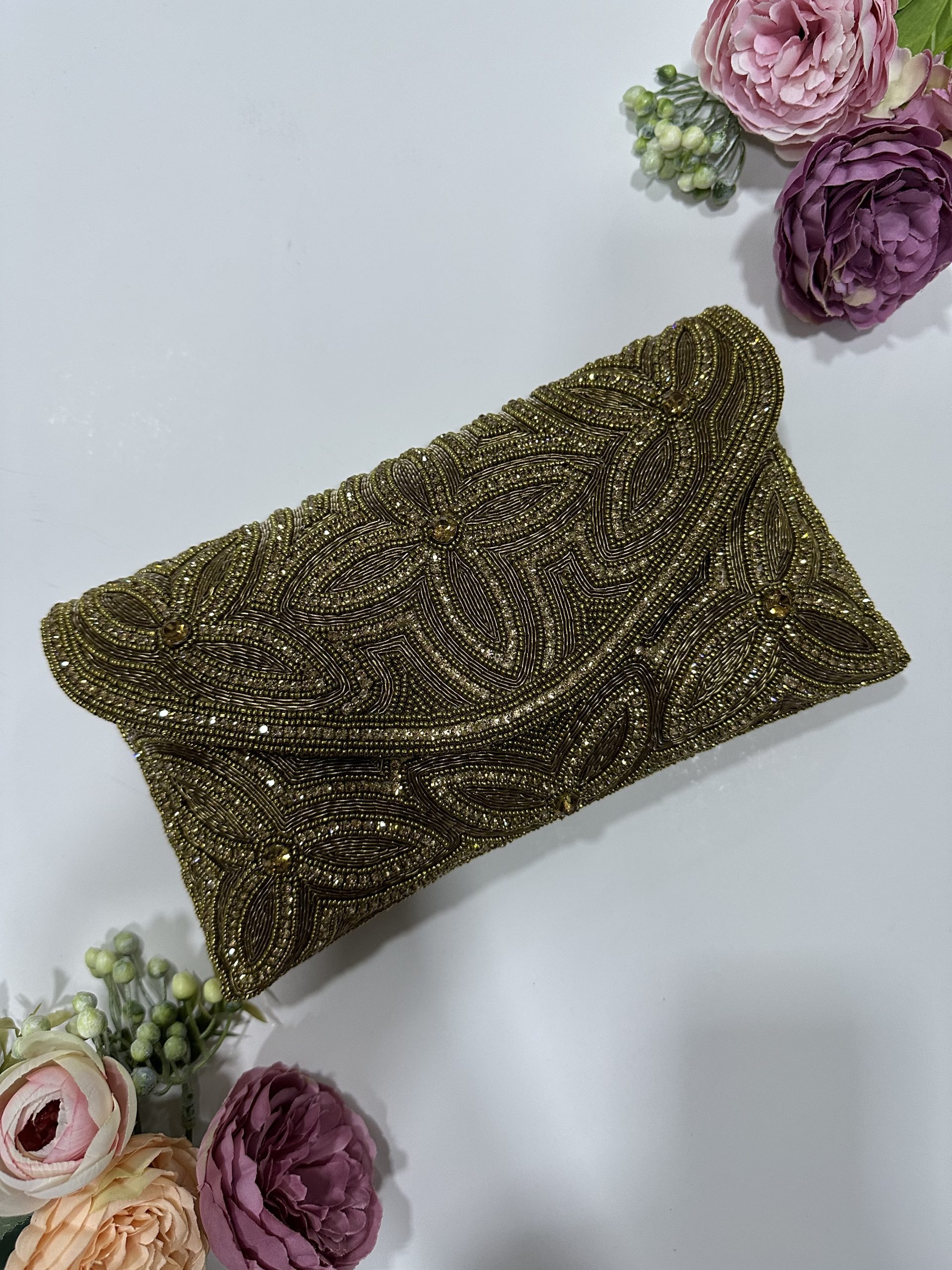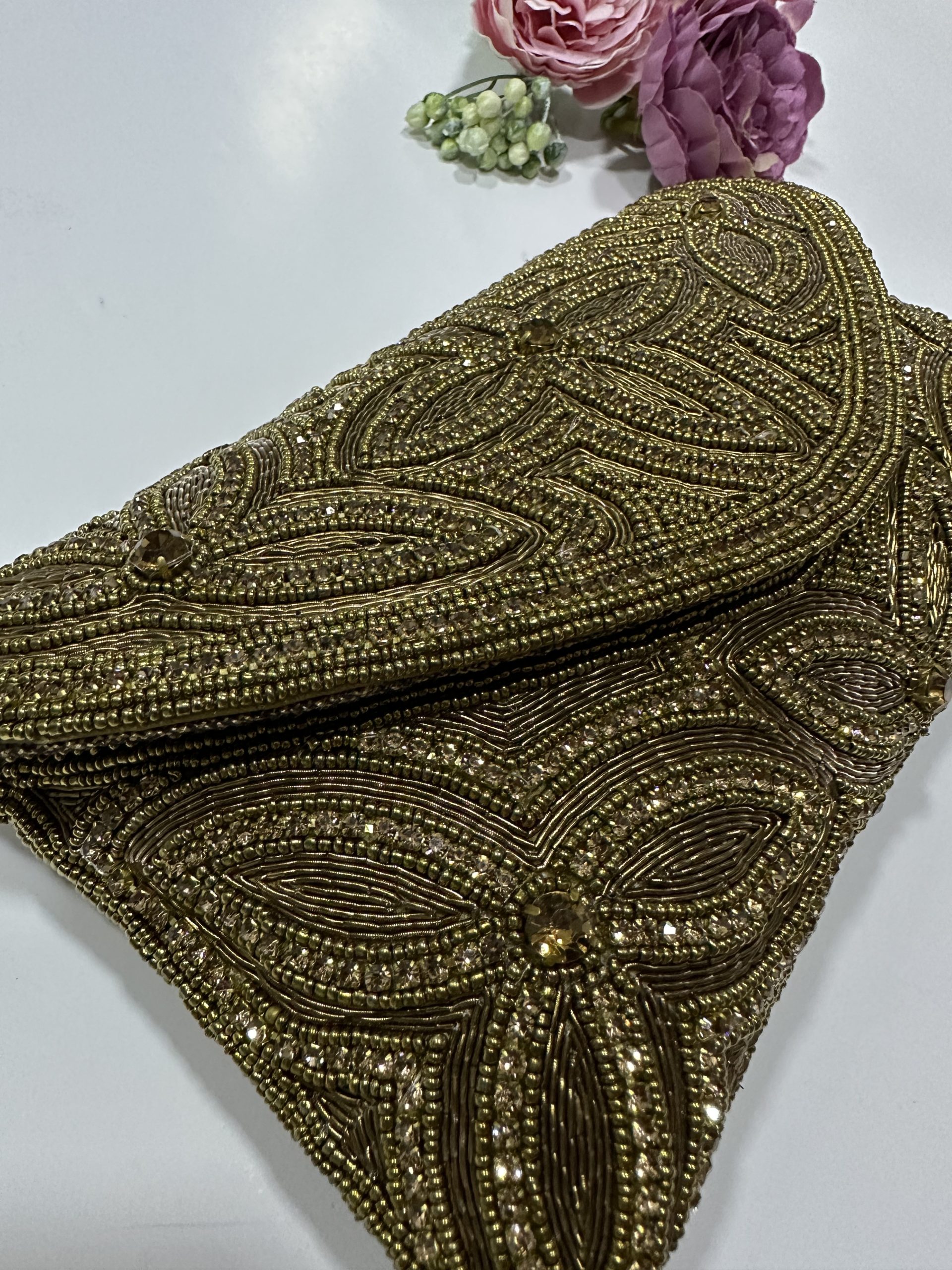 Off white velvet +gold crystals